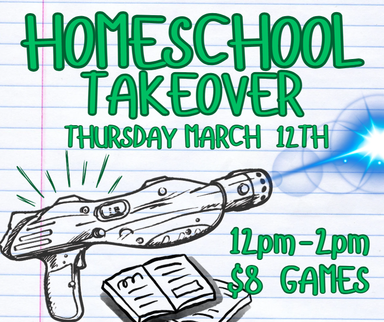 Join us March 12th from 12pm–2pm for $8 laser tag games during this private event just for homeschooled kids of all ages 🎯